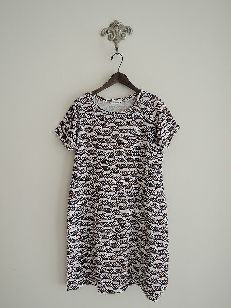 デザイン:2014年 春夏コレクション mina perhonen 「nami」のワンピースです。カラーはホワイトベースに、ライトピンク×ブラウン×ネイビーの総柄プリントです。カットソー素材であしらわれ、プルオーバータイプのシンプルなデザインです。(掲載写真は、実商品のカラーにできるだけ近づけるよう努力はしておりますが、お使いのモニターや画面設定等によっては、色が異なって見える場合もございますので、予めご了承下さい)