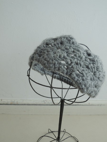 デザイン:mina perhonen ミナペルホネン×hitomi shinoyamaのヘアアクセです。カラーはグレーで、柄編みが施されたシンプルなデザインです。シルバー×クリアのラインストーンのお花モチーフがボタン代わりになっており、ホールに通して留めて頂くデザインです。