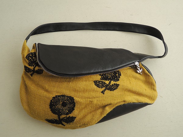 デザイン:mina perhonenのchumシリーズのショルダーバッグです。カラーはブラックのレザーとマスタード×ブラックのお花刺繍生地の組合せで、開口部はファスナーです。上部を折り返して頂くデザインで、内側にはダークオリーブの裏地とポケットが1つ付いています。定価は44,100円です。