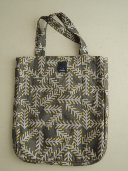 デザイン:mina perhonenのtwigシリーズのトートバッグです。カラーはグレー地にシルバーとイエローの総柄が全体に施されたデザインで、内側は薄いサーモンピンクの裏地とポケットが1つ付いています。素材は表地が絹50%、毛50%、裏地が綿100%です。