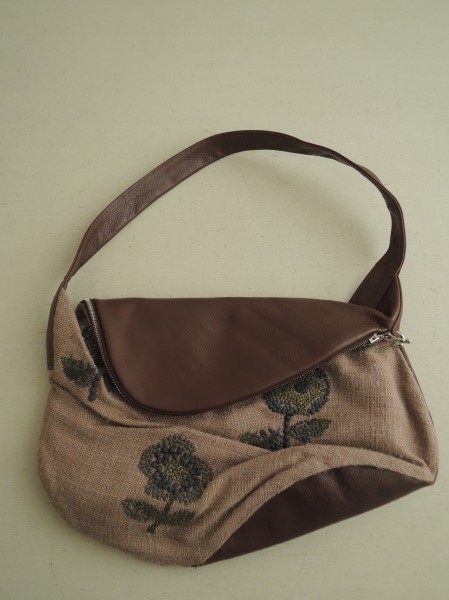 デザイン:mina perhonenのchumシリーズのショルダーバッグです。カラーは薄ブラウン地にグレー・ブルーグレー・グリーンでお花の刺繍 が施されたデザインで、持ち手・開口部フラップ・背面はブラウンのレザーです。開口部はファスナーで、内側にはダークブラウンの裏地とポケットが1つございます。素材 は表生地は絹100%、刺繍部分が綿76%、レーヨン24%、裏生地が麻100%で、レザー部分には牛革が使用されおります。