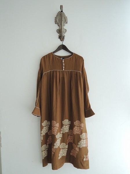 デザイン:mina perhonen「grapes 」の刺繍ワンピースです。カラーはブラウンベースに、くすんだピンク×ライトベージュで刺繍が施されています。薄手素材であしらわれ、フロントはループボタン半開で、裏地はございません。定価は56,700円のお品です。(掲載写真は、実商品のカラーにできるだけ近づけるよう努力はしておりますが、お使いのモニターや画面設定等によっては、色が異なって見える場合もございますので、予めご了承下さい)