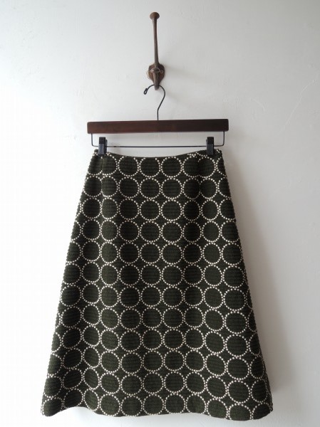 デザイン:mina「tambourine」の刺繍ウールスカートです。カラーはダークグリーンのコーデュロイの様な畝のある素材にライトベージュのサークル刺繍が施されています。左腰フック&ファスナーで着脱でき、裏地付きです。 (掲載写真は、実商品のカラーにできるだけ近づけるよう努力はしておりますが、お使いのモニターや画面設定等によっては、色が異なって見える場合もございますので、予めご了承下さい)