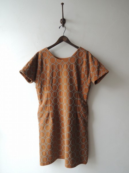 デザイン:mina perhonen「 tambourine」の刺繍ワンピースです。カラーはブラウン×グレーグリーンのサークル刺繍入りで、プルオーバータイプの着脱になります。フロント両サイドにタック、両腰ポケット、裏地付きで、定価54,600円です。 (掲載写真は、実商品のカラーにできるだけ近づけるよう努力はしておりますが、お使いのモニターや画面設定等によっては、色が異なって見える場合もございますので、予めご了承下さい)
