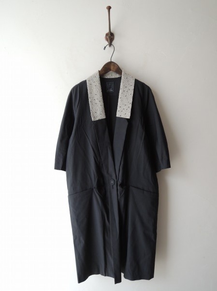 デザイン:mina perhonen「shiny shadow」のコートです。カラーは濃グレーで、1つボタン開閉になります。衿部分にライトベージュの刺繍地が施され、バックスリット15cm入りです。両腰ポケット付きです。 (掲載写真は、実商品のカラーにできるだけ近づけるよう努力はしておりますが、お使いのモニターや画面設定等によっては、色が異なって見える場合もございますので、予めご了承下さい)