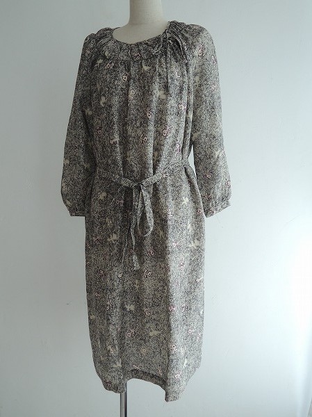 デザイン:mina perhonen 「unforgettable moment」のワンピースです。カラーはベージュベースにブラック・グレー・パープルのプリント入りの薄手生地であしらわれております。フロント左ネックにひも結び付きで、共布ベルトひも付きです。 (掲載写真は、実商品のカラーにできるだけ近づけるよう努力はしておりますが、お使いのモニターや画面設定等によっては、色が異なって見える場合もございますので、予めご了承下さい)