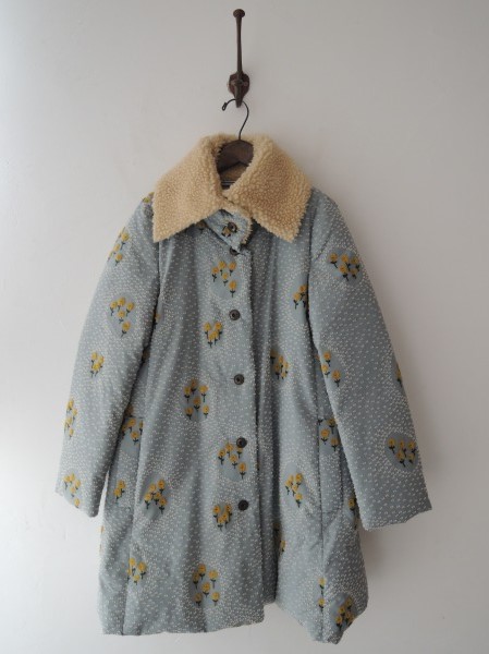 デザイン:mina perhonen 「ballade」の刺繍ダウンコートです。カラーはグレーブルー地に白・黄・緑など刺繍、フロントボタンで、前両腰にポケットがございます。後裾に44cmのボタン付きスリットが施され、裏地付きで、衿はボア素材があしらわれております (掲載写真は、実商品のカラーにできるだけ近づけるよう努力はしておりますが、お使いのモニターや画面設定等によっては、色が異なって見える場合もございますので、予めご了承下さい)