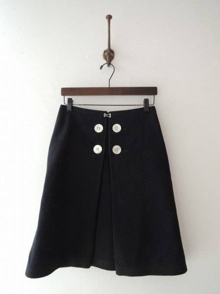 デザイン:mina perhonen 「judo」のボックススカートです。カラーはネイビー×褪せ感のある黒で、凹凸のある柔道着風の厚手生地です。フロントのボタン&フックでの開閉です。裾は柔道の帯風の生地であしらわれ、裏地、ポケットはございません。 (掲載写真は、実商品のカラーにできるだけ近づけるよう努力はしておりますが、お使いのモニターや画面設定等によっては、色が異なって見える場合もございますので、予めご了承下さい)