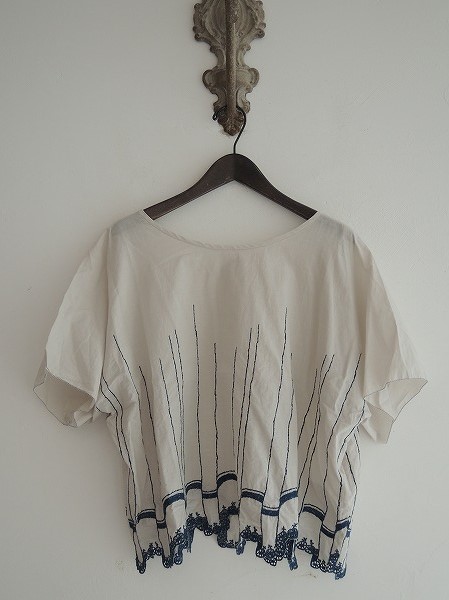デザイン: mina perhonen 「waltz」のブラウスです。カラーはグレーベージュで、裾辺りにはネイビーの刺繍があしらわれています。やや透け感のある薄手素材で、バック首のループボタンで着脱します。定価31,500円です。 (掲載写真は、実商品のカラーにできるだけ近づけるよう努力はしておりますが、お使いのモニターや画面設定等によっては、色が異なって見える場合もございますので、予めご了承下さい)