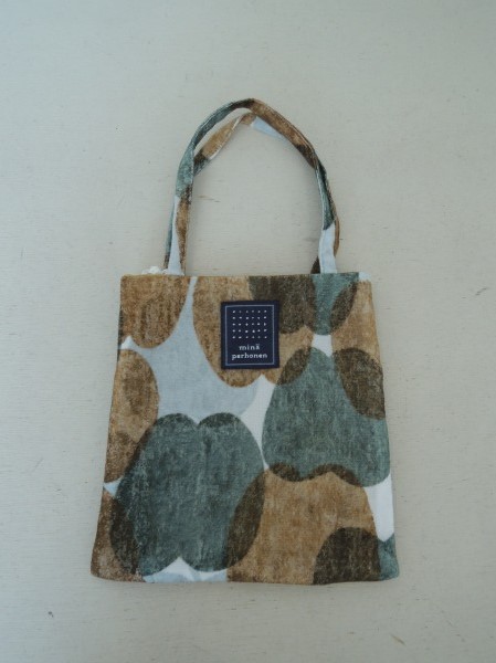 デザイン:ミナペルホネンmina perhonenのpommeシリーズのミニバッグです。カラーはグレーグリーン、ライトグレー、ブラウン等のアップル柄のベルベット地で、内側は光沢のあるくすんだイエローグリーン地で施されています。素材は表地 キュプラ100%、裏地 ポリエステル100%です。
