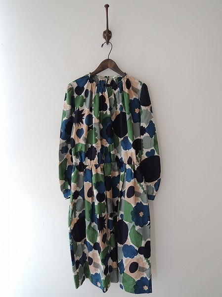 デザイン:mina perhonen 「flower basket」のワンピースです。カラーはグリーン・ネイビー・グレー・ピンクなどの総柄プリントで、やや薄手生地であしらわれております。バックネックにループボタン&ドロップホール付きで、衿ぐりにピコカット&ギャザーが施されています。ウエストにはゴム入りで、裏地はございません。 (掲載写真は、実商品のカラーにできるだけ近づけるよう努力はしておりますが、お使いのモニターや画面設定等によっては、色が異なって見える場合もございますので、予めご了承下さい)