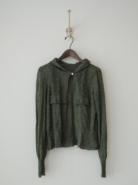デザイン:mina perhonen 「sorbet」のニットカーディガンです。カラーはモスグリーンのミックスで薄手のニットであしらわれております。フード&フロント肩部分は透かし編みで施されており、フロントにはパールのようなミラーボールボタンが1つ付いております。定価31,500円です。 (掲載写真は、実商品のカラーにできるだけ近づけるよう努力はしておりますが、お使いのモニターや画面設定等によっては、色が異なって見える場合もございますので、予めご了承下さい)