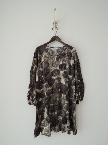 デザイン:mina perhonen 「shadow snow」のチュニックワンピースです。ライトベージュベースにブラック&ブラウン系カーキ系のプリント入りのアンゴラ混の薄手生地であしらわれております。肘下から袖上部にギャザーが施されており、Aラインシルエットになっております (掲載写真は、実商品のカラーにできるだけ近づけるよう努力はしておりますが、お使いのモニターや画面設定等によっては、色が異なって見える場合もございますので、予めご了承下さい)