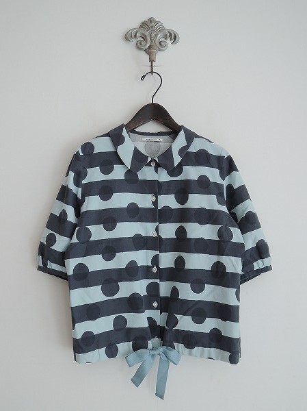 デザイン:mina perhonen「friend 」のドット柄ブラウスです。カラーはライトブルー×グレーのドット&ストライプ柄です。ボタン開閉で、裾にひもが通っております。(掲載写真は、実商品のカラーにできるだけ近づけるよう努力はしておりますが、お使いのモニターや画面設定等によっては、色が異なって見える場合もございますので、予めご了承下さい)