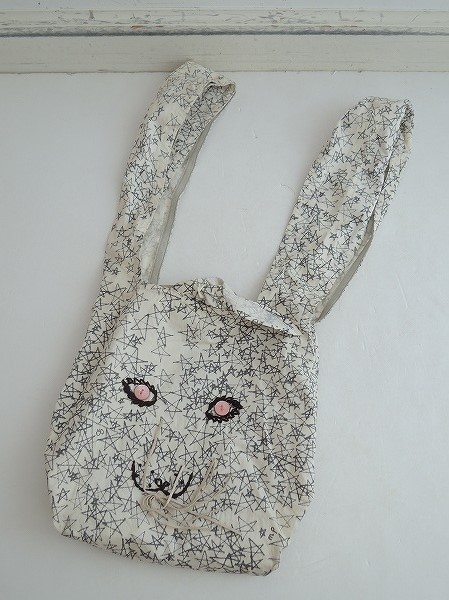 デザイン:mina perhonen galileoシリーズのうさバッグです。カラーはオフホワイト地にグレーで手書き風のお星さまが全面にプリントされており、ピンクのボタン、ダークブラウンの刺繍、ライトベージュの革紐でうさぎさんのお顔にデザインされたお品です。持ち手がうさぎさんの耳の様になっており、内側にはポケットが1つ付いています。素材は綿100%です。