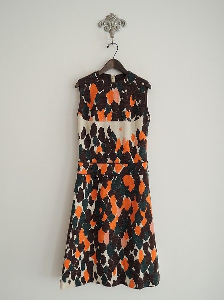 デザイン:mina perhonen 「trees」のウールワンピースです。カラーはオレンジ・ダークブラウン・ダークグリーン・アイボリーで、総柄プリントの毛羽のある生地であしらわれております。背上部のフック&ファスナー、左脇下のファスナーで着脱でき、裏地付きです。 定価48,300円の商品です。(掲載写真は、実商品のカラーにできるだけ近づけるよう努力はしておりますが、お使いのモニターや画面設定等によっては、色が異なって見える場合もございますので、予めご了承下さい)
