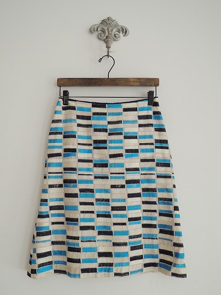 デザイン:mina perhonen「lake」の刺繍スカートです。カラーはベージュ地に、光沢のあるベージュ・クリームホワイト・鮮やかなライトブルー・濃紺の刺繍入りで、左腰フック&ファスナーで着脱できます。裏地付きです。 (掲載写真は、実商品のカラーにできるだけ近づけるよう努力はしておりますが、お使いのモニターや画面設定等によっては、色が異なって見える場合もございますので、予めご了承下さい)