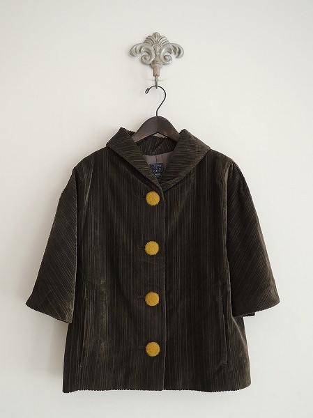 デザイン:mina perhonen 「fuzz」のジャケットです。カラーはダークグリーンで、ランダムに配列されたコーデュロイ生地であしらわれております。フロントボタンはマスター ドカラーの毛羽のあるくるみボタンになっており、両腰にポケット&裏地付きです。 (掲載写真は、実商品のカラーにできるだけ近づけるよう努力はしておりますが、お使いのモニターや画面設定等によっては、色が異なって見える場合もございますので、予めご了承下さい)
