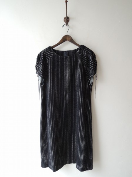 デザイン:mina perhonen「field lane」のストライプワンピースです。カラーは黒に近い濃紺×ライトグレーで、毛羽感のあるストライプ織の生地であしらわれております。両肩に飾りボタンが施され、袖口上部にひもが通っております。裏地付きです。 (掲載写真は、実商品のカラーにできるだけ近づけるよう努力はしておりますが、お使いのモニターや画面設定等によっては、色が異なって見える場合もございますので、予めご了承下さい)