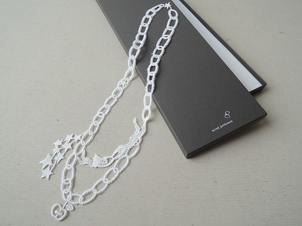 デザイン:mina perhonenのpoemシリーズの刺繍ネックレスです。カラーはホワイトで、女の子や星があしらわれた刺繍デザインです。※ネックレスのみです。