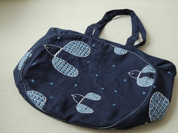 デザイン:2014年 SSコレクション mina perhonenのploverシリーズのミャオバッグです。カラーはネイビー地に水色・オフホワイトで小鳥の刺繍が施されたデザインで、パイピングはネイビーの合皮です。開口部はファスナーで、内側には水色の裏地とポケットが1つ付いています。素材は表生地が麻100%、刺繍部分が綿100%、裏生地が綿100%です。