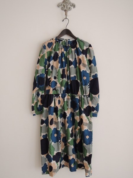 デザイン:mina perhonen 「flower basket」のワンピースです。カラーは白に近いライトベージュベースに、紺・緑・ピンクなどの総柄プリントで、薄手生地であしらわれております。バックネックのループボタンで着脱し、衿ぐりにはピコカット&ギャザーが施されています。ウエストにはゴム入りで、裏地はございません。 (掲載写真は、実商品のカラーにできるだけ近づけるよう努力はしておりますが、お使いのモニターや画面設定等によっては、色が異なって見える場合もございますので、予めご了承下さい)
