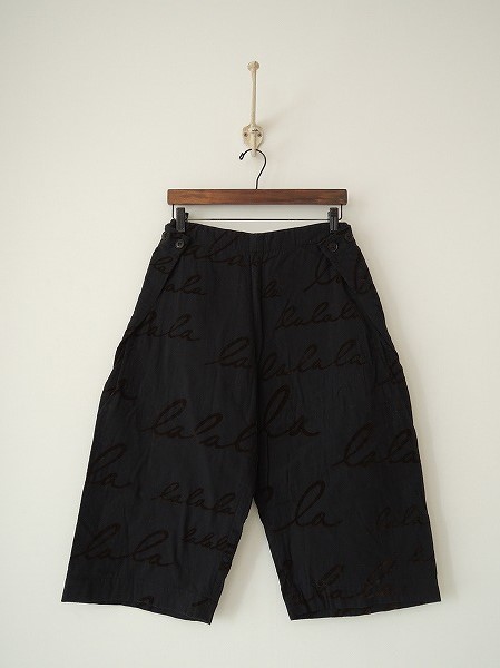 デザイン:mina perhonen 「lalala」のフロッキープリントパンツです。カラーは濃紺で、光沢のあるブラウンでフロッキープリントがあしらわれております。ウエストはサイドにとったタックを折りたたんでボタンで留める仕様 で、両ヒップにポケットがあります。(掲載写真は、実商品のカラーにできるだけ近づけるよう努力はしておりますが、お使いのモニターや画面設定等によっては、色が異なって見える場合もございますので、予めご了承下さい)