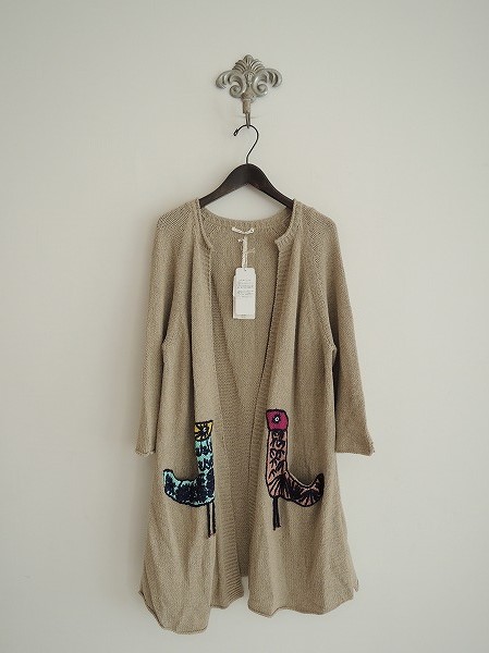 デザイン:mina perhonen 「mingling」のカーディガンです。カラーはベージュで、紺・水色・黄緑&紺・赤紫・ピンクの鳥の刺繍&柄編みがあしらわれております。鳥の足部分は揺れるデザインになっており、鳥の背部分&バック右サイドにポケットが施されております。フロントの留め具は付いておりません。袖口に2cm、両裾に3cmのスリット入りです。定価50,400円です。 (掲載写真は、実商品のカラーにできるだけ近づけるよう努力はしておりますが、お使いのモニターや画面設定等によっては、色が異なって見える場合もございますので、予めご了承下さい)