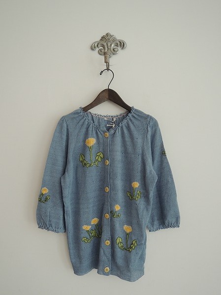 デザイン:mina perhonen 「dandelion」のカーディガンです。カラーはくすんだブルーで、針抜きが施された薄手のニット素材に、イエロー×グリーンなどでたんぽぽの刺繍があしらわれています。フロントボタン開閉で、衿ぐり&袖口にはゴムが通っています。定価50,400円です。(掲載写真は、実商品のカラーにできるだけ近づけるよう努力はしておりますが、お使いのモニターや画面設定等によっては、色が異なって見える場合もございますので、予めご了承下さい)