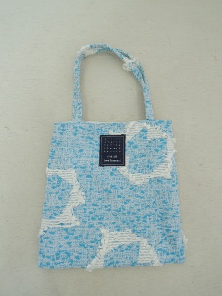 デザイン:mina perhonenのcieloシリーズのミニバッグです。カラーはブルー系ベースに、オフホワイトのこより状の紙で刺繍があしらわれております。内側はホワイトです。素材は表地が綿80%・紙20%、裏地がポリエステル100%です。