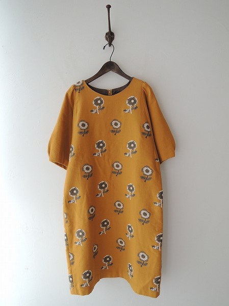 デザイン:mina perhonen 「chum」の刺繍ワンピースです。カラーはマスタードで、ツイル地であしらわれており、オフ白・グリーン系カーキなどの花柄刺繍が施されております。背上部のフック&ファスナーで着脱でき、裏地付きです。 (掲載写真は、実商品のカラーにできるだけ近づけるよう努力はしておりますが、お使いのモニターや画面設定等によっては、色が異なって見える場合もございますので、予めご了承下さい)