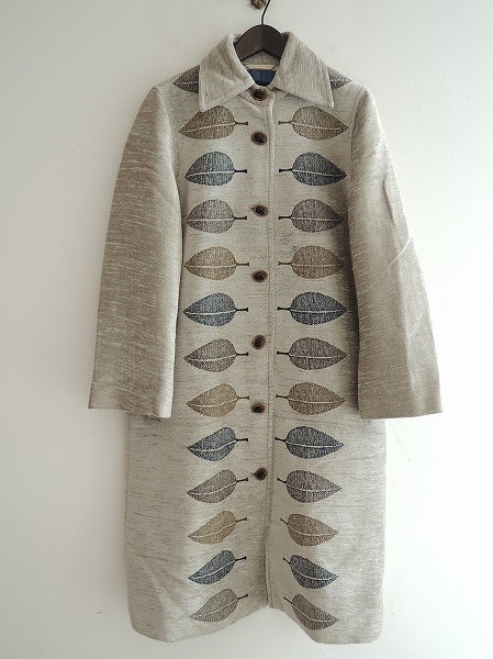デザイン:mina perhonen「happa」の刺繍コートです。カラーはカラーはグレーベージュで、光沢感のあるモール地ベースにブラウン・ネイビー系などで葉っぱ模様の刺繍があしらわれています。フロントボタンで着脱でき、裏地はオフホワイト×くすんだ青のストライプ柄です。左胸内側&両腰にはポケットがあり、後ろ裾には26cmのセンターベントがございます。 (掲載写真は、実商品のカラーにできるだけ近づけるよう努力はしておりますが、お使いのモニターや画面設定等によっては、色が異なって見える場合もございますので、予めご了承下さい)