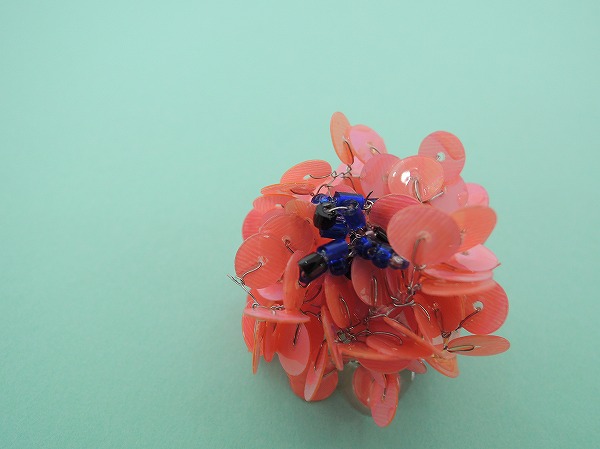 デザイン:mina perhonenのceremonyシリーズのスパンコールブローチです。カラーはピンクのスパンコールとネイビーのビーズが、シルバーのワイヤーでランダムに繋がれ、全体に樹脂加工が施されたデザインです。