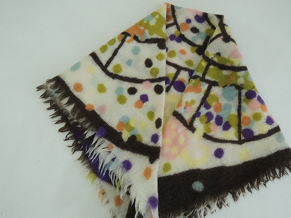 デザイン:mina perhonenの総柄ストールです。カラーはブラウン・パステルイエロー・パステルピンク・抹茶色等の総柄が、ウールの様なやや薄手の素材に施されたデザインです。フチ周りには短いフリンジがあしらわれております。