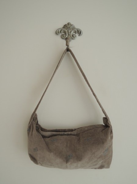 デザイン:mina perhonenのchouchoシリーズのボディバッグ小です。カラーはベージュグレー系のベルベット地に、水色の蝶々の刺繍が施されたデザインで、開閉ファスナーにシルバーの小鳥のモチーフがあしらわれています。内側はくすんだ濃い水色の裏地にポケットが1つ付いており、素材は表生地・刺繍部分・裏生地共に綿100%です。