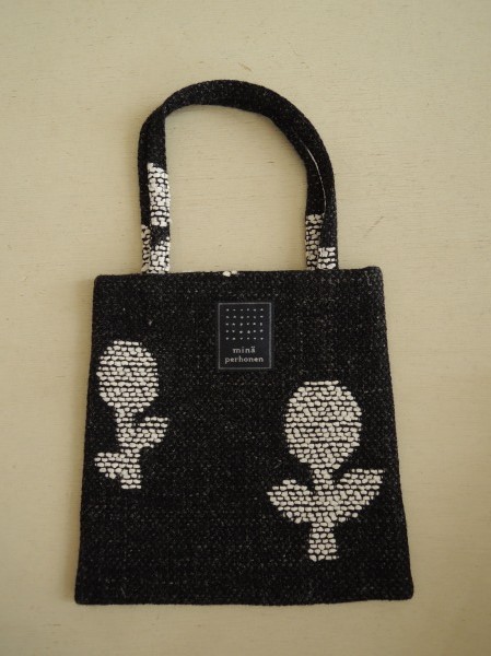 デザイン:mina perhonenのsnow cookieシリーズのミニバッグです。カラーはブラックとグレーのミックスで、オフホワイトのペーパー素材の花柄刺繍が施されており、内側は光沢のあるブラックの裏地であしらわれています。素材は表地が指定外繊維(紙)54%、毛43%、麻3%、裏地がポリエステル100%です。