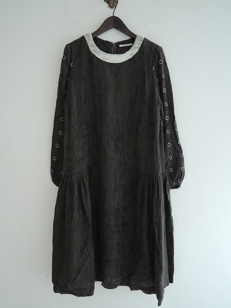 デザイン:mina perhonen 「drops」の長袖ワンピースです。カラーはダークグレーのパイル地で、背中のフックとファスナーで着脱できます。袖に円の刺繍があしらわれています。袖口にゴム入りで、裏地つきです。 (掲載写真は、実商品のカラーにできるだけ近づけるよう努力はしておりますが、お使いのモニターや画面設定等によっては、色が異なって見える場合もございますので、予めご了承下さい)