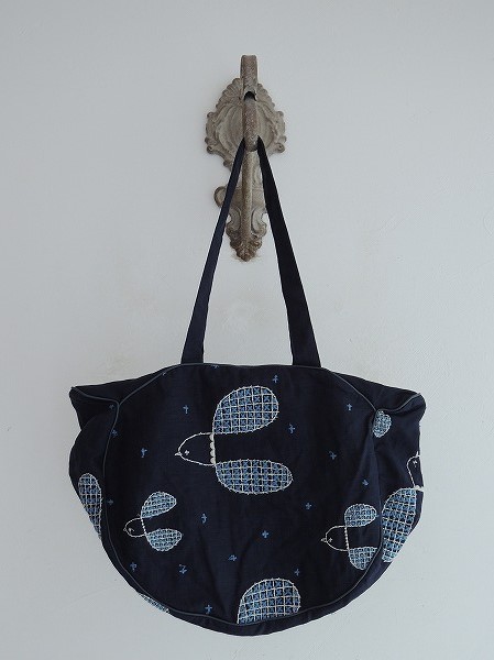デザイン:2014年SSコレクション mina perhonenのploverシリーズのミャオバッグです。カラーはネイビー地に水色・オフホワイトで小鳥の刺繍が施されたデザインで、パイピングは濃紺の合皮です。開口部はファスナーで、内側には水色の裏地とポケットが1つ付いています。素材は表生地が麻100%、刺繍部分・裏生地が綿100%です。本体価格¥20,000です。