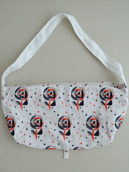 デザイン:2014年SSコレクション mina perhonenのsand roseシリーズのボディバッグ小です。カラーはホワイト地に朱色・ブラック・ベージュ・ピーコックブルーでお花とドット模様の刺繍が一面に施されたデザインで、開口部はファスナーです。内側には明るい黄土色の裏地とポケットが1つ付いています。素材は表生地が麻100%、刺繍部分・裏生地が綿100%です。本体価格¥23,000です。