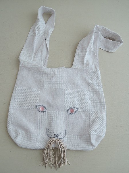 デザイン:2014年SSコレクション mina perhonenのusa bag-saltpanシリーズのうさバッグ大です。カラーはホワイトで、格子織りやボーダー織り等の幾何学の織り生地で、フロントにはピンクのボタン・グレーの刺繍・ライトベージュの革ヒモで、うさぎさんの顔が施されています。持ち手は耳のようにあしらわれ、内側にはポケットが1つございます。素材は綿100%です。