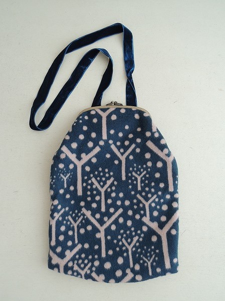 デザイン:mina perhonenのfruttaシリーズのエンベロープバッグです。カラーはネイビーの少し毛羽のあるフリース生地に薄いピンクの総柄で、開口部は小鳥のモチーフがあしらわれたがま口です。内側にはブラック×ブラウンのボーダー柄の裏地とポケットが1つ付いており、持ち手は光沢のあるネイビーのベルベットリボンです。定価は29,400円です。