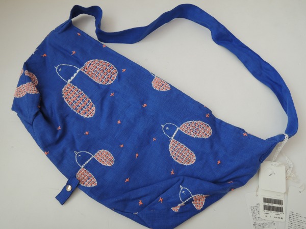 デザイン:2014年SSコレクション mina perhonenのploverシリーズのボディバッグ小です。カラーはブルー地にホワイト・サーモンピンクで小鳥の刺繍が施されたデザインで、開口部はファスナーです。内側にはライトベージュの裏地とポケットが1つあり、素材は表生地が麻100%、刺繍部分・裏生地が綿100%です。