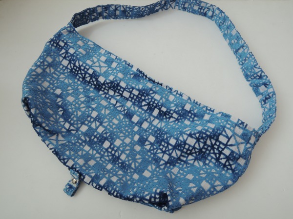 デザイン:2014年SSコレクション mina perhonenのmeriシリーズのボディバッグ小です。カラーはパープルブルー×ホワイトのミックス地に、光沢のあるくすんだブルーのパイルジャガードが一面に施されたデザインで、開口部はファスナーです。内側には淡いラベンダーの裏地とポケットが1つ付いており、素材は表生地がベースが麻100%、パイルがアクリル100%、裏生地が綿100%です。