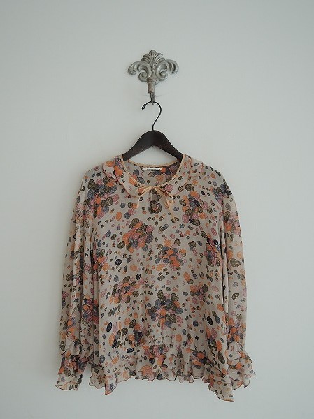 デザイン:minaperhonen「gem」のシルクシフォンブラウスです。カラーはグレーベージュ地にオレンジ・グレー・深緑・ピンクなどのプリントが施されたシルクシフォン地であしらわれております。衿ぐりにベージュのテープがあしらわれ、袖口&裾にフリル付きです。 (掲載写真は、実商品のカラーにできるだけ近づけるよう努力はしておりますが、お使いのモニターや画面設定等によっては、色が異なって見える場合もございますので、予めご了承下さい)