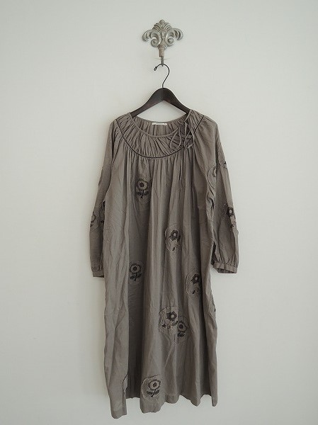 デザイン:mina perhonen 「chum」の刺繍ワンピースです。カラーはグレーで、お花刺繍のモチーフが施された薄手素材であしらわれております。襟ぐりにギャザーが施され、ヒモが付いています。付属のインナー付きです (掲載写真は、実商品のカラーにできるだけ近づけるよう努力はしておりますが、お使いのモニターや画面設定等によっては、色が異なって見える場合もございますので、予めご了承下さい)