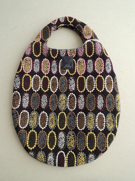 デザイン:mina perhonenのtarteシリーズのエッグバッグです。カラーは濃紺ベースに、イエロー・えんじ・ホワイト・薄ピンク等の刺繍が全面にあしらわれたデザインで、縁周りにブラックの合皮のパイピングと、内側はネイビーグレーの裏地が施されています。素材は表生地が毛100%、刺繍部分がアクリル60%、毛40%で、裏生地がポリエステル100%です。