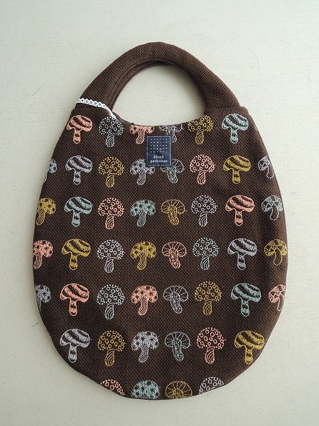 デザイン:mina perhonenのpolkaシリーズのエッグバッグです。カラーはダークブラウン地に、ピンク・・サックス・ブラウンベージュ等のきのこの刺繍が一面にあしらわれており、縁周りにダークブラウンの合皮のパイピングと、内側はダークブラウンの裏地が施されています。素材は表地-毛61%、絹39% 刺繍部-綿100% 裏地-ポリエステル100%です。