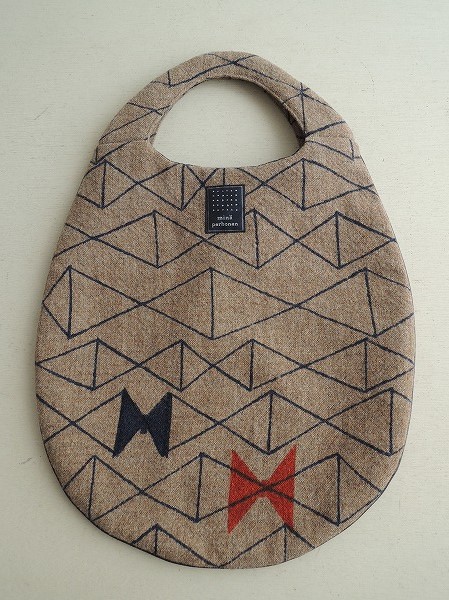 デザイン:mina perhonenのmariposaシリーズのエッグバッグです。カラーはブラウン×ベージュのミックスベースに、ネイビー・ブラウン・朱色の総柄プリントで、パイピング部分はダークネイビーの合皮です。内側にはネイビーの裏地付きで、素材は表地が毛90%、ナイロン10%で、裏地がポリエステル100%です。