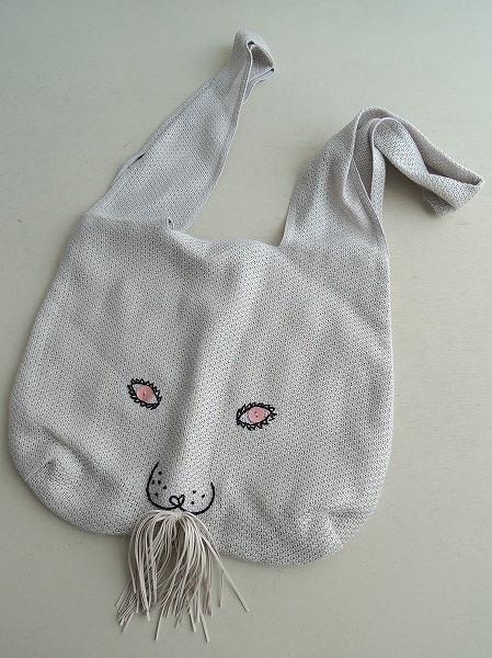 デザイン:mina perhonenのusa bagシリーズのうさバッグ大です。カラーはライトグレーで、透けのあるレース編みが全体に施されています。フロントにはブラックの刺繍f・ピンクのボタン・ライトベージュの革紐で、うさぎさんのお顔がデザインされており、持ち手は耳の様にあしらわれています。内側にはイエローグリーンの裏地とポケットが1つ付いています。素材は表生地・裏生地共に麻100%です