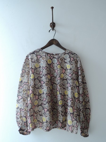 デザイン:mina perhonen 「Hanna」の総柄ブラウスです。カラーはピンクベースに、ブラック・モカベージュ・イエロー・グレーなどの総柄プリントの薄手生地であしらわれております。背上部はタック入りで、バック襟元は生地を寄せてボタン留めで着用するデザインになっております。(掲載写真は、実商品のカラーにできるだけ近づけるよう努力はしておりますが、お使いのモニターや画面設定等によっては、色が異なって見える場合もございますので、予めご了承下さい)